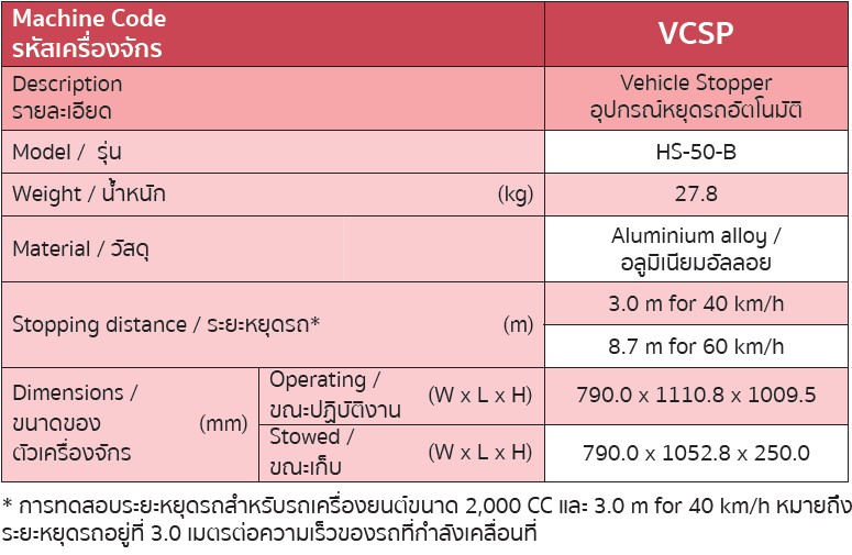*การทดสอบระยะหยุดรถสําหรับรถเครื่องยนต์ขนาด 2,000 CC และ 3.0 m for 40 km/h หมายถึง ระยะหยุดรถอยู่ที่ 3.0 เมตรต่อความเร็วของรถที่กําลังเคลื่อนที่